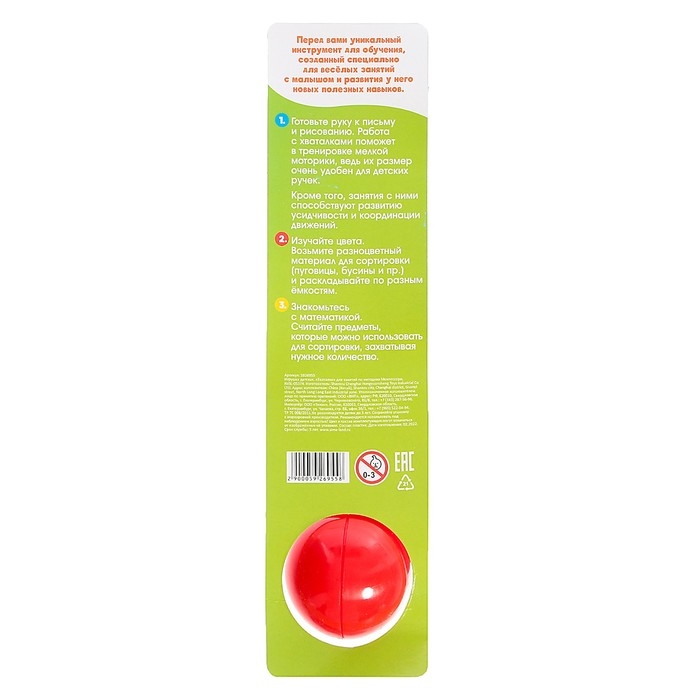 Хваталка предназначена для занятий по методике Монтессори. С ней малыш потренирует координацию движений и мелкую моторику рук.