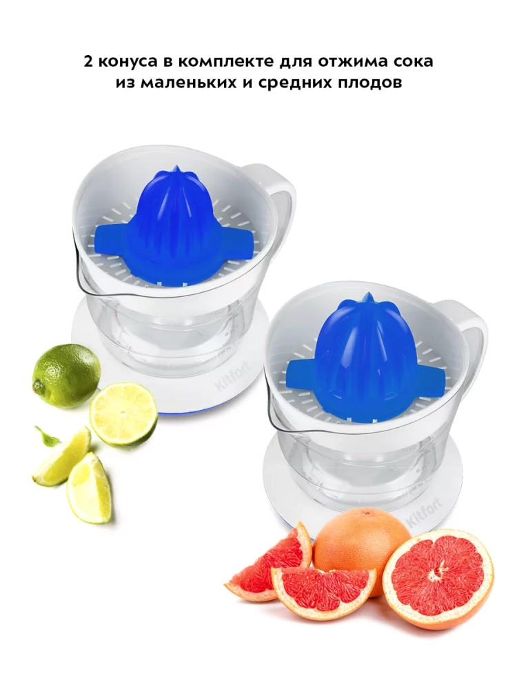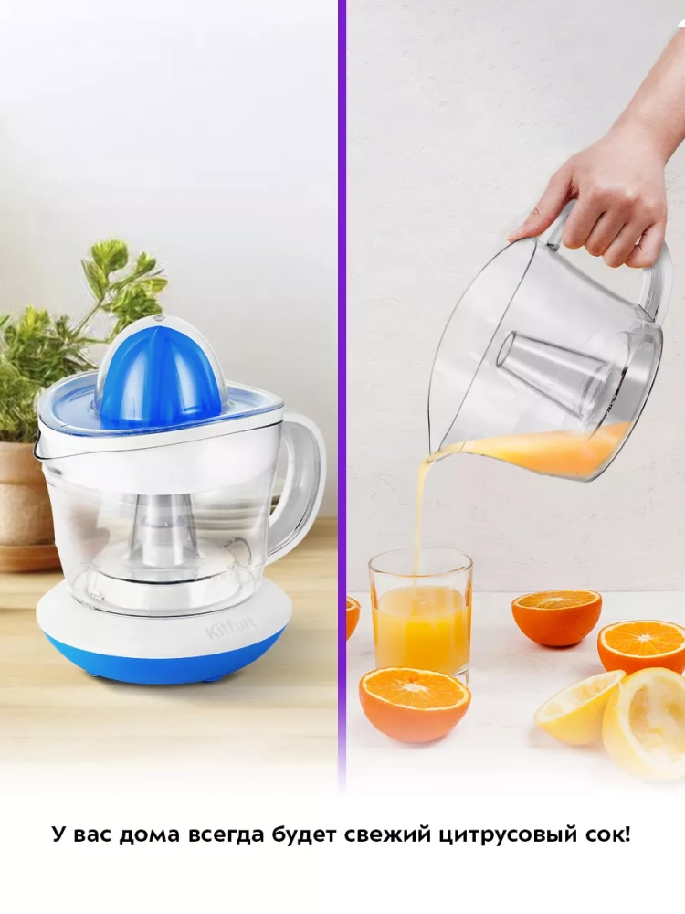 Соковыжималка Kitfort КТ-1148 предназначена для отжима сока из плодов цитрусовых: лимонов, грейпфрутов, апельсинов и др. Главное преимущество соковыжималки для цитрусовых — для нее не требуется очищать цитрусы от корки, их лишь необходимо предварительно разрезать пополам поперек долек.