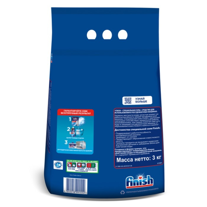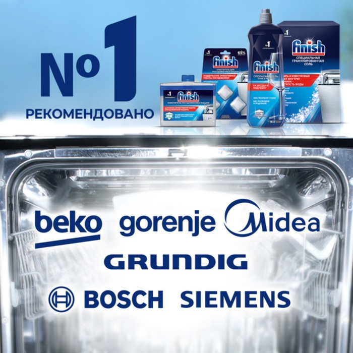 Уровень жесткости воды зачастую влияет на работоспособность вашей посудомоечной машины. Специальная соль Finish с крупными гранулами способствует правильной работе ионообменника, тем самым помогая смягчать воду и защищая посудомоечную машину от образования известкового налета и накипи, что также помогает предотвратить появление пятен и водных подтеков на вашей посуде. Создана в форме гранул, что предотвращает повреждение блока смягчения воды в посудомоечной машине, а также не вызывает коррозию внутренних деталей. Не содержит примесей и добавок. Необходимо добавлять соль для посудомоечных машин в специальный резервуар вашей посудомоечной машины. Не забывайте регулярно добавлять соль для посудомоечных машин, если вы заметите, что ее осталось мало. В некоторых машинах о низком уровне соли сигнализирует мигание красного индикатора. В этом случае обязательно добавьте соль!