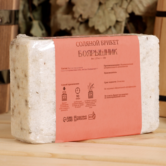 Применение: нагревайте брикет на печи не менее 90 минут, затем поддайте на него горячей воды. Соль наполнит воздух бани ионами, тем самым поможет снять усталость, улучшить кровообращение и общее самочувствие.