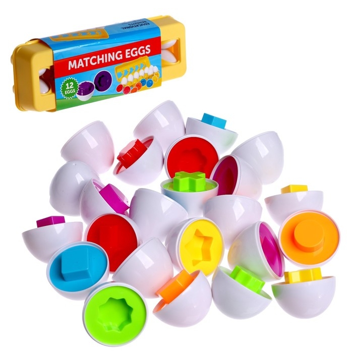 - Детали сортера — яйца, каждое делится на две части. Перемешайте детали, а ребёнок будет искать подходящие половинки.