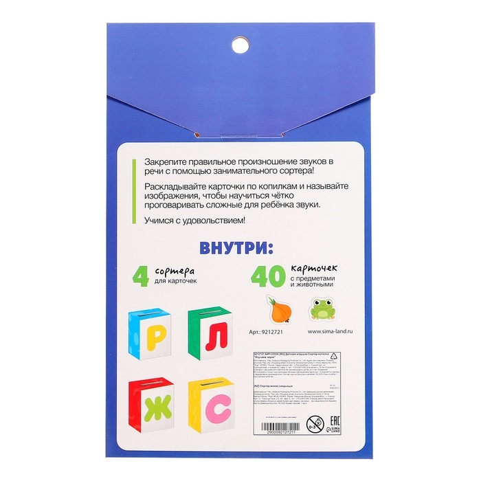 Внутри вы найдёте 4 сортера-копилки и 40 карточек с предметами и животными.