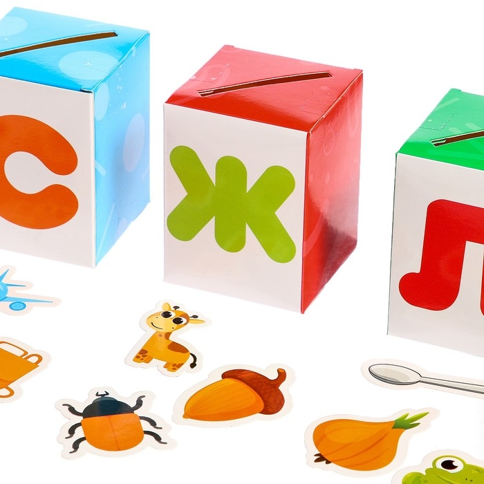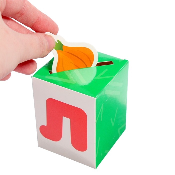 - Попросите кроху опустить карточку в подходящее отверстие. Например, фигурку с изображением лягушки — в коробочку с буквой «Л», а ракету — в копилку с буквой «Р» и т. д.
