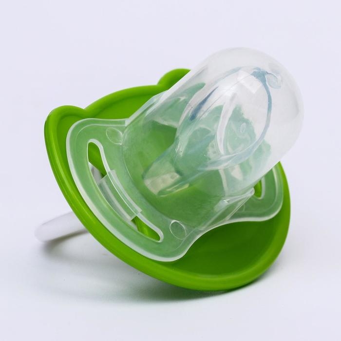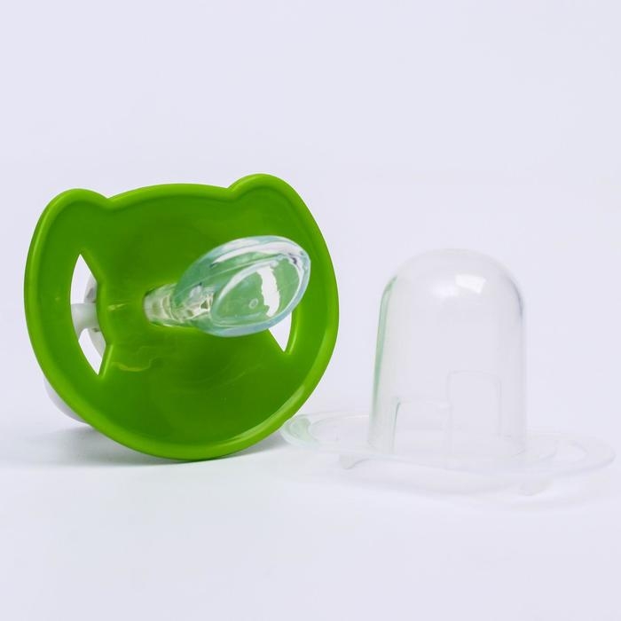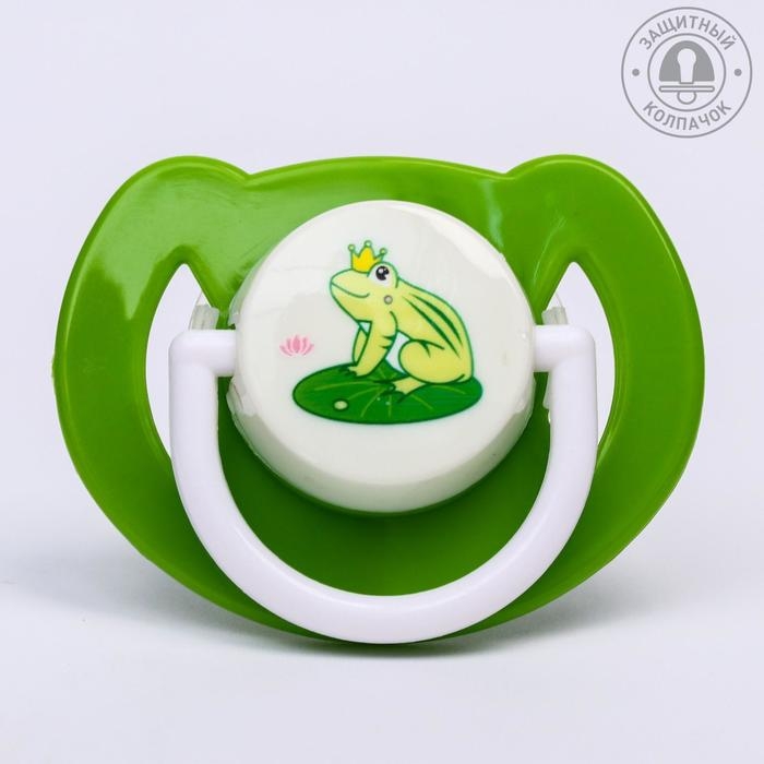 Соска - пустышка силиконовая ортодонтическая «Лягушка», от 6 мес., с колпачком, цвет зеленый