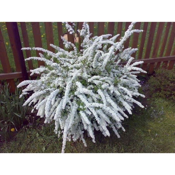 Неприхотливый кустарник с поникающими ветвями и раскидистой кроной. Листья зеленые. Цветки снежно-белые, полностью покрывают побеги прошлого года. Зимостойка.