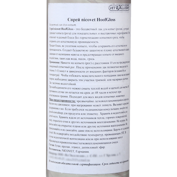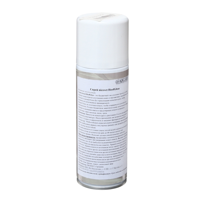 Спрей для копыт Безцветный HoofGloss - это бесцветный лак для копыт (рогов), который украшает копыта (рога) для показательных и выставочных мероприятий. Он оставляет чудесный блеск без герметизации копытного рога, чтобы сохранить его естественную проницаемость. Придает блеск, не уплотняя копыто, чтобы сохранить его естественную проницаемость. Создает безцветную защитную пленку естественного цвета защищая от налипания навоза и предотвращая копыто от внешнего воздействия, таких как вода, песок, грязь.