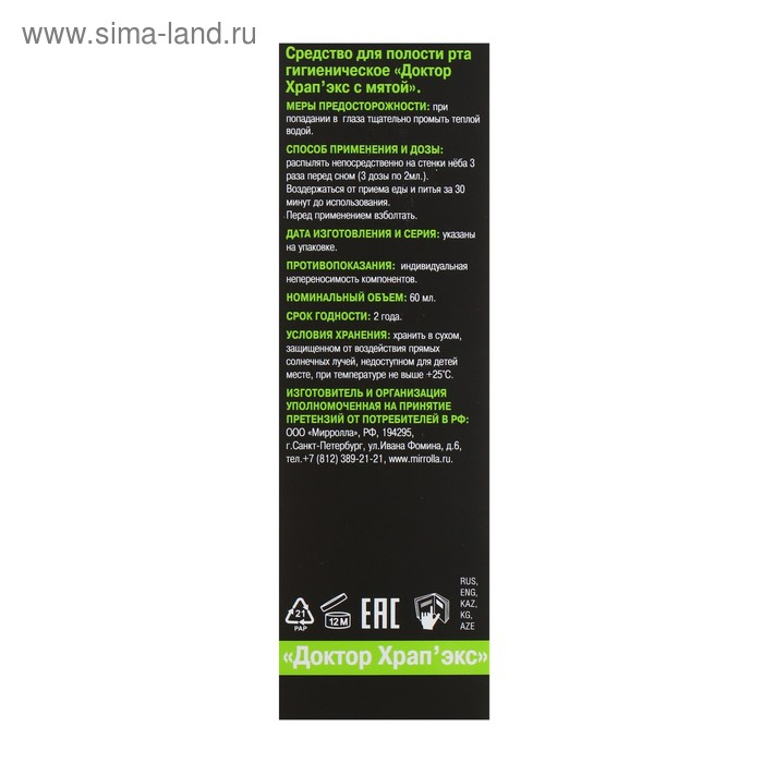 Спрей «Доктор Храп 'Экс» с мятой, 60 мл