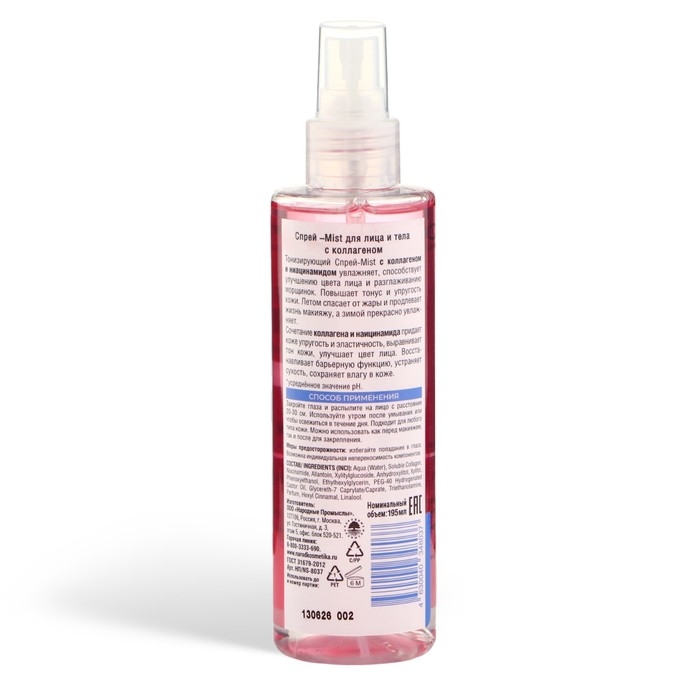 Спрей мист для тела и лица тонизирующий с коллагеном и ниацинамидом увлажняет и придаёт сияние коже. Мист для тела мгновенно освежает и увлажняет кожу. Спрей способствует улучшению цвета лица и разглаживанию морщинок. Повышает тонус и упругость кожи. Летом спасает от жары и продлевает жизнь макияжу, а зимой прекрасно увлажняет. Мист возвращает коже чувство комфорта. Успокаивает, восстанавливает гидробаланс, улучшает состояние кожи. Мист содержит комплекс из коллагена и ниацинамида придает коже упругость и эластичность, выравнивает тон кожи, улучшает цвет лица. Имеет нейтральный уровень рН 5,5. Восстанавливает барьерную функцию, устраняет сухость, сохраняет влагу в коже. Спрей подходит для ежедневного ухода за лицом. Используйте спрей в течение дня, когда кожа будет нуждаться в дополнительном увлажнении.