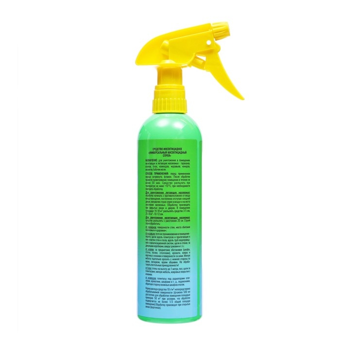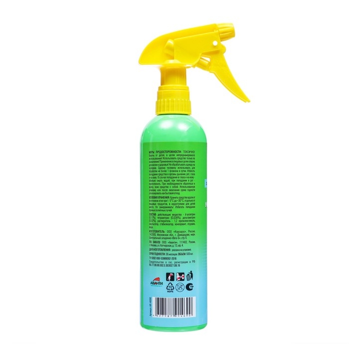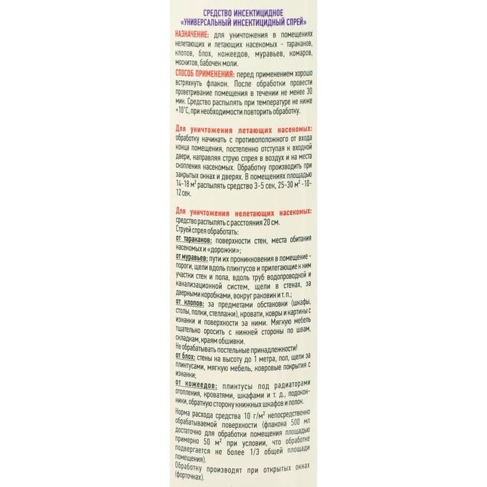Описание:Универсальный инсектицидный спрей ARGUS от КЛОПОВ и ТАРАКАНОВ, блох, а также от муравьев , комаров, моли, кожееда 500 мл. для ПРОФЕССИОНАЛЬНОГО и БЫТОВОГО применения. Норма расхода средства 10г/ кв.м ( флакона объемом 500 мл достаточно для обработки помещения площадью примерно 50 кв.м)Способ применения:Перед применением хорошо встряхнуть флакон. После обработки провести проветривание помещения в течении не менее 30 мин. Средство распылять при температуре не ниже +10С, при необходимости повторить обработку.Для уничтожения летающих насекомых : обработку начинать с противоположного от входа конца помещения , постепенно отступая к входной двери, направляя струю спрея в воздух и на места скопления насекомых. Обработку производить при закрытых окнах и дверях.В помещениях площадью 14-18 кв.м распылять средство 3-5 сек., 25-30 кв.м -10-12 сек.Для уничтожения нелетающих насекомых: средство распылять с расстояния 20 см. Струей спрея обработать: от тараканов: поверхности стен, места обитания насекомых и "дорожки" от муравьев: пути их проникновения в помещение -пороги, щели вдоль плинтусов и прилегающие к ним участки стен и пола, вдоль труб водопроводной и канализационной систем, щели в стенах , за дверными коробками, вокруг раковин и т.п; от клопов: за предметами обстановки( шкафы, столы, полки, стеллажи), кровати, ковры и картины с изнанки и поверхности за ними. Мягкую мебель тщательно оросить с нижней стороны по швам, складкам, краям обшивки . Не обрабатывать постельные принадлежности! от блох: стены на высоту до 1 метра , пол, щели за плинтусами, мягкую мебель , ковровые покрытия с изнанки. от кожеедов: плинтусы под радиаторами отопления, кроватями, шкафами и т.д, подоконники, обратную сторону книжных шкафов и полок.Действующее вещество:: d-аллетрин, тетраметрин, дельтаметрин