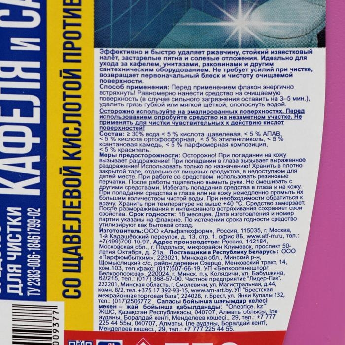 Состав: 30% вода, 5% кислота щавелевая, 5% апав, 5% кислота ортофосфорная, 5% этиленгликоль, 5% ксановая камедь, 5% парфюмерная композиция, 5% краситель.