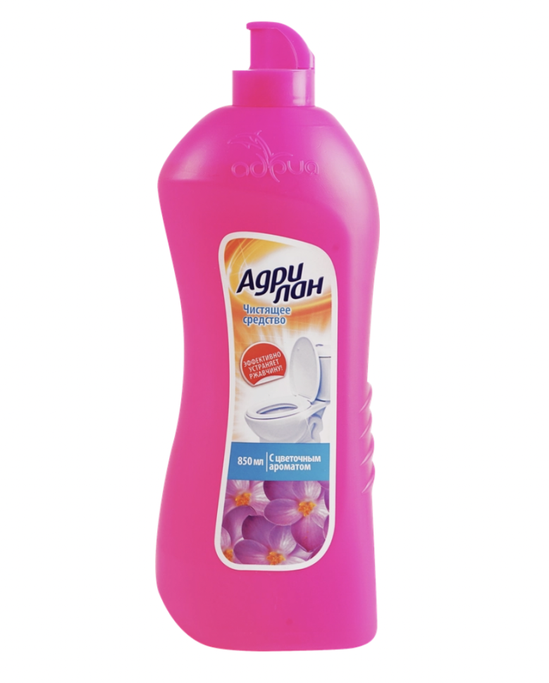 Пластиковая бутылка. Средство для чистки сантехники АДРИЛАН сочетает в себе чистящий и моющий эффекты. Продукт содержит сбалансированный комплекс ПАВ, эффективно смывающий загрязнения широкого спектра строения (окислы, ржавчина, соли жесткости, бактерии и микроорганизмы), а также дезинфицирует на 100%. Средство содержит кислоту, поэтому его рекомендуется применять только на поверхностях, покрытых кислотостойкой эмалью!