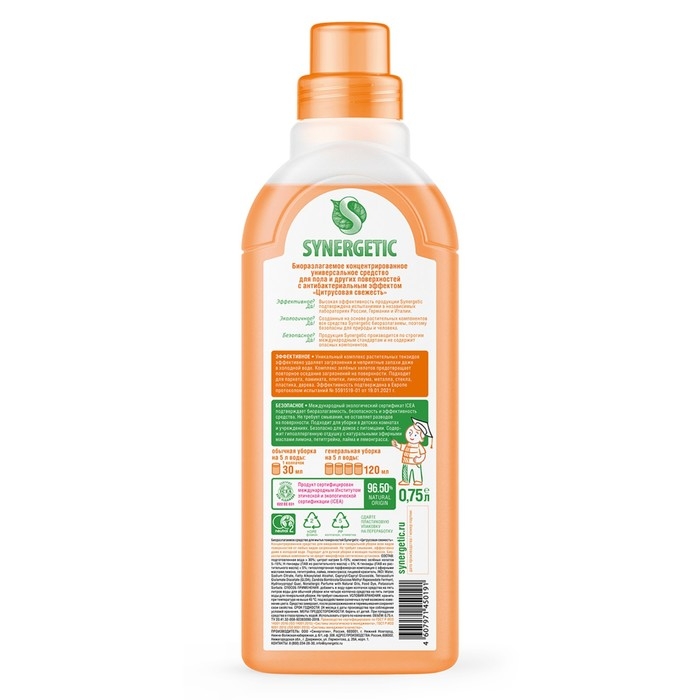 Биоразлагаемое концентрированное средство с антибактериальным эффектом SYNERGETIC "Цитрусовая свежесть" - универсальное средство для ежедневной и генеральной уборки пола и других поверхностей: столов, стен, потолка.