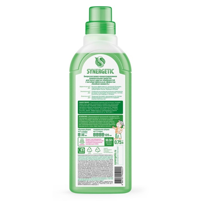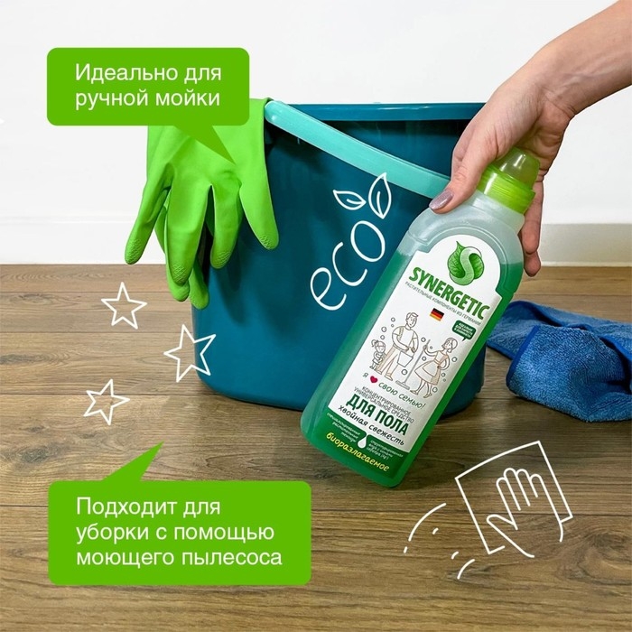 Биоразлагаемое концентрированное средство с антибактериальным эффектом SYNERGETIC "Хвойная свежесть" - универсальное средство для ежедневной и генеральной уборки пола и других поверхностей: столов, стен, потолка.