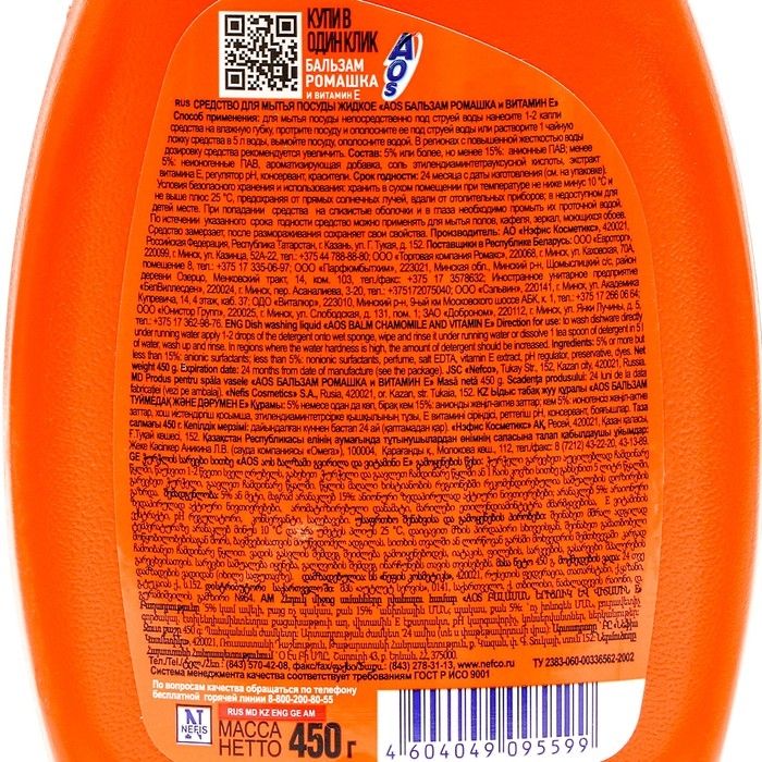 Средство для мытья посуды Aos "Ромашка и витамин Е", 450 мл