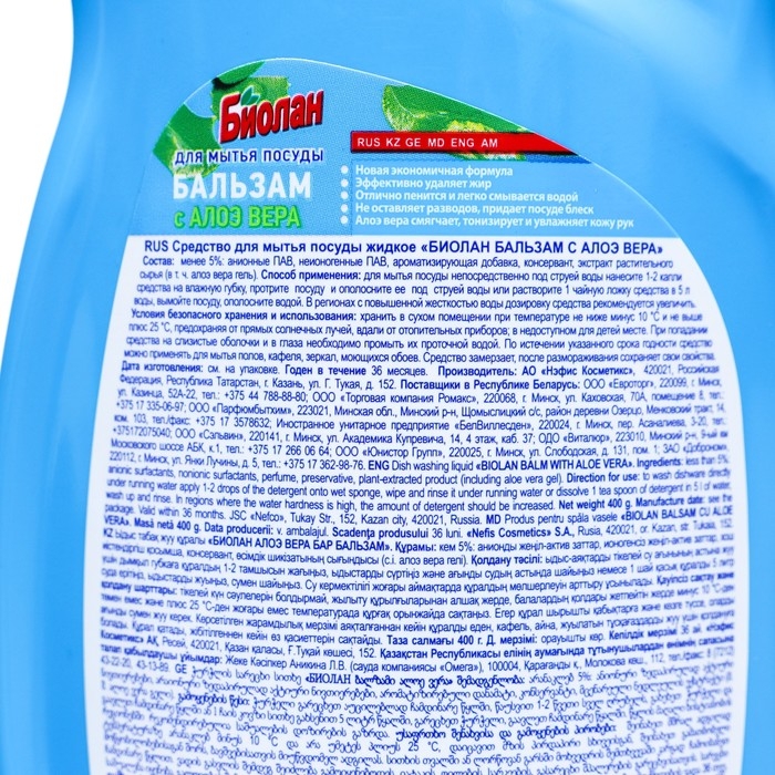 Средство для мытья посуды Биолан Бальзам "Алоэ вера", 400 мл