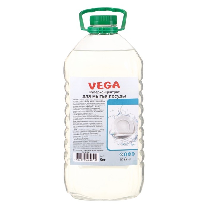 Средство концентрированное VEGA "Супер концентрат"для ручного мытья всех видов посуды и столовых приборов, очистки и обезжиривания кухонного оборудования, рабочих и различных твердых поверхностей на кухне. Средство обладает высокой моющей и обезжиривающей способностью, эффективно в воде любой жесткости и температуры. В готовом виде рекомендуется использовать для ручного мытья керамической, стеклянной, фаянсовой, хрустальной, металлической, деревянной и другой посуды. В разбавленном виде для очистки внутренних и внешних поверхностей кухонного оборудования, рабочих поверхностей, столов и любых влагостойких поверхностей. Средство нейтрально, не повреждает обрабатываемые поверхности.