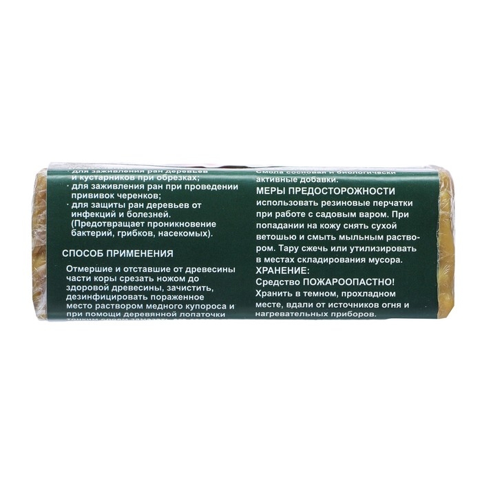 Средство для заживления ран плодовых и декоративных деревьев, причиняемых прививками, оккулированием или обрезкой ветвей, солнечными ожогами. Важные свойства: предотвращает проникновение бактерий, грибков, насекомых; не смывается дождем; обработанная варом рана не нуждается в обматывании или другой дополнительной обработке. Рекомендации по применению: Вар деревянной лопаточкой наносится тонким слоем на свежий срез дерева, на поврежденные участки коры, которую предварительно зачищают. При заделке глубоких ран разрешается добавлять в размягченный вар наполнитель (мел, доломит и др.).