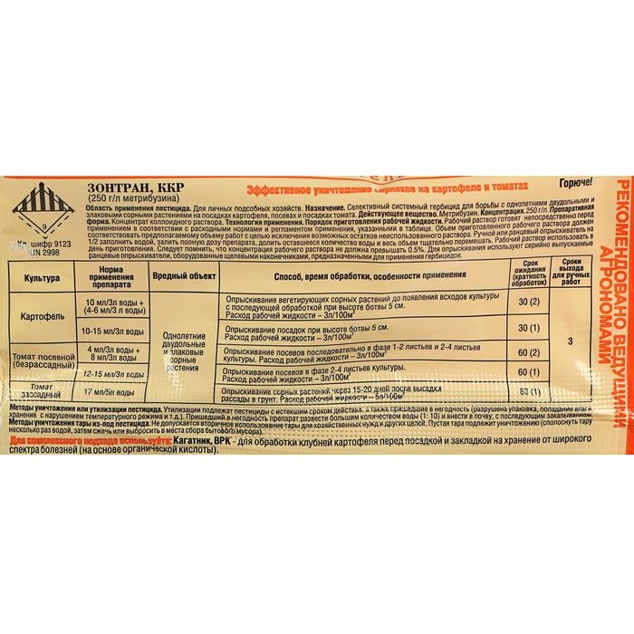Препаративная форма – концентрат коллоидного раствора – обеспечивает быстрое проникновение метрибузина в растение и хорошую адгезию препарата на листе. За счет этого достигается высокая биологическая эффективность при меньшем расходе метрибузина.