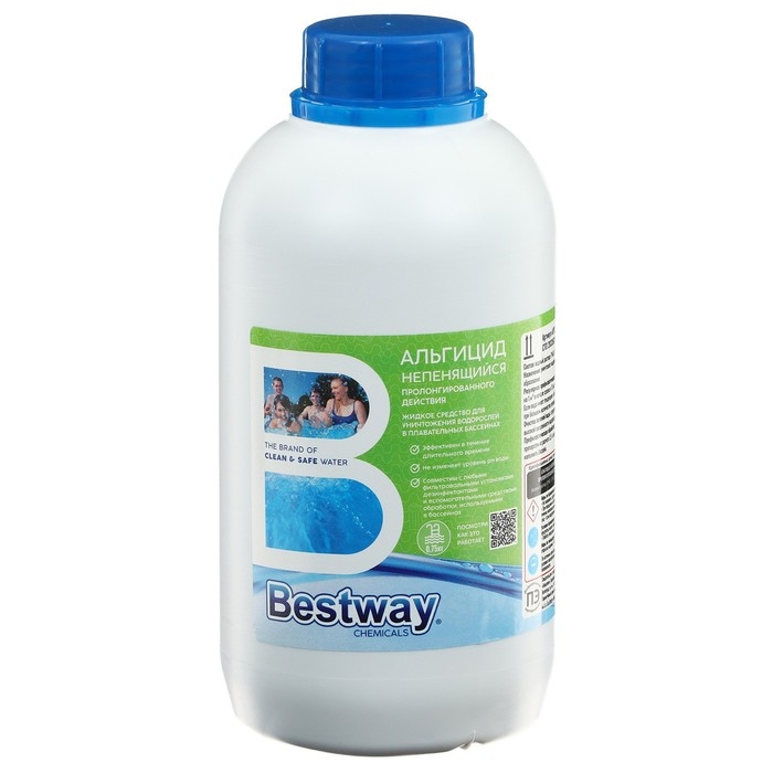 Альгицид Bestway непенящийся пролонгированного действия уничтожает водоросли в воде бассейна и предупреждает их образование.