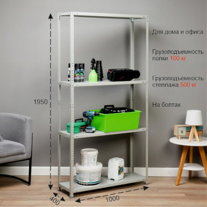 Стеллаж металлический, MS 1950x1000x400, 4 полки