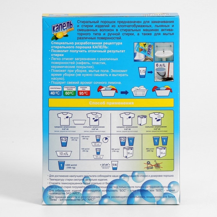Стиральный порошок предназначен для стирки изделий из хлопчатобумажных, льняных и синтетических волокон в стиральных машинах активированного типа и ручной стирки, а также для мытья различных поверхностей.