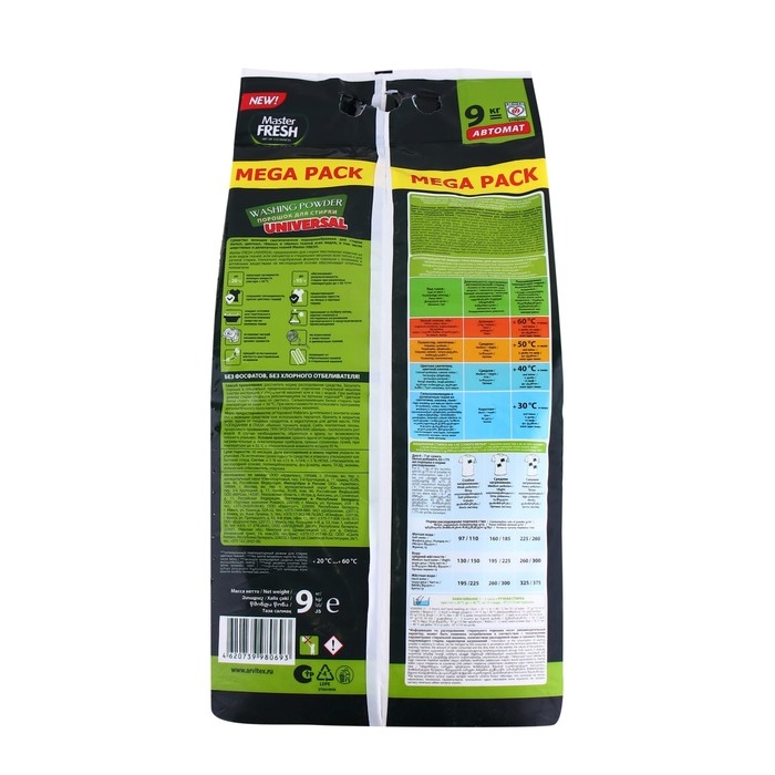 Порошок для стирки Master FRESH универсальный безопасен для окружающей среды. Он не содержит фосфатов, хлора и других вредных химических веществ.
