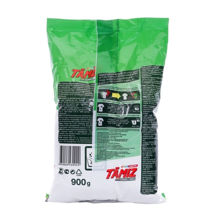 Порошок "TAMIZ" подходит для всех типов тканей и может использоваться как для белого, так и для цветного белья. Он эффективно удаляет различные виды пятен, включая жирные и масляные, и оставляет после себя приятный свежий аромат.
