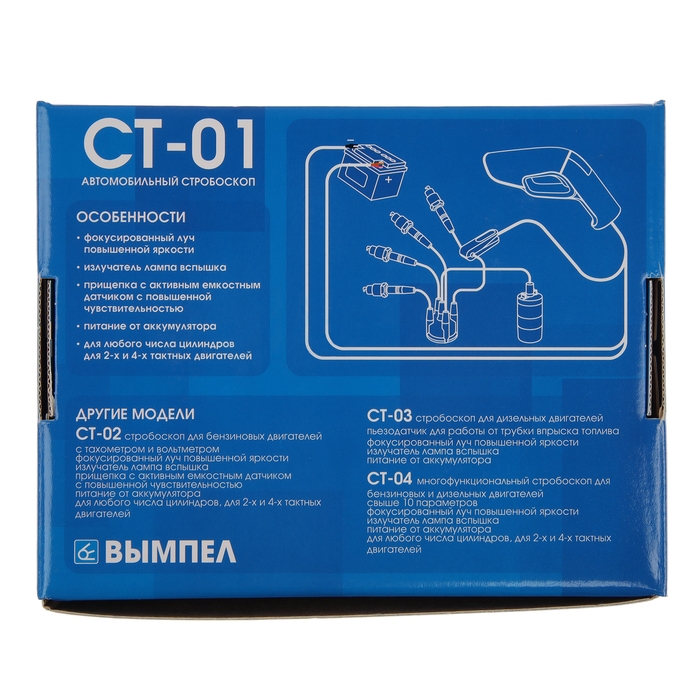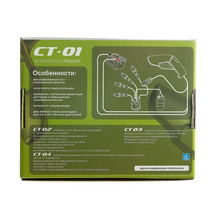 Автомобильный стробоскоп СТ - 01 предназначен для измерения и правильной установки угла опережения зажигания на карбюраторных и инжекторных бензиновых двигателях и оперативного контроля работы основных узлов автомобиля при проведении диагностических и ремонтных работ.