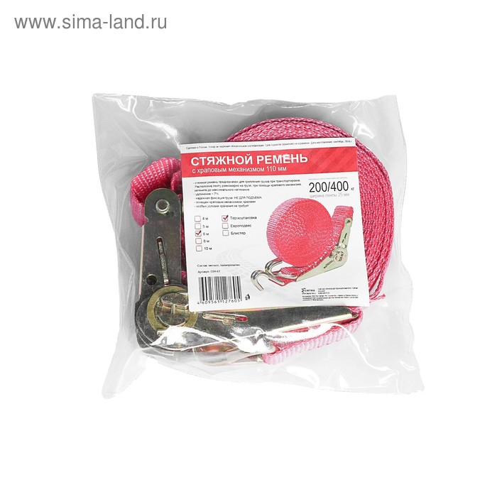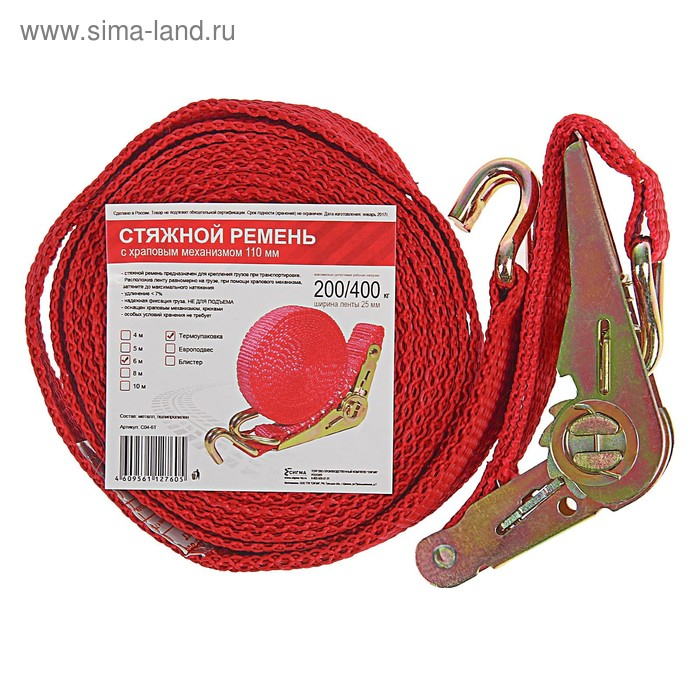 Стяжка груза с механизмом 110 мм, ширина ленты 25 мм, нагрузка 200/400 кг, длина 6 м