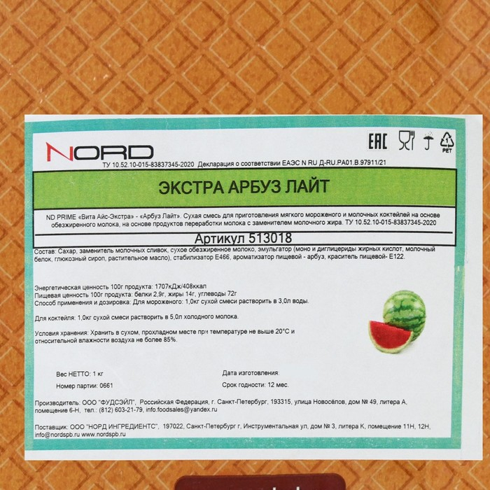 Состав: сахар, заменитель молочных сливок, сухое обезжиренное молоко, эмульгатор (моно и диглицериды жирных кислот, молочный белок, глюкозный сироп, растительное масло), стабилизатор – Е466, ароматизатор пищевой – арбуз, краситель пищевой – Е122.