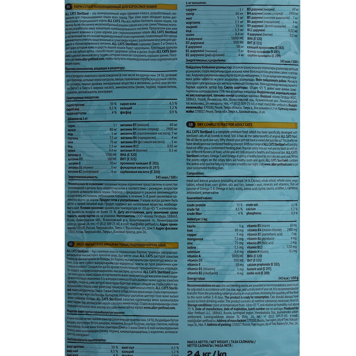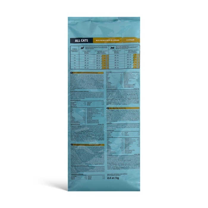 ALL CATS производится из высококачественного сырья, не содержит ГМО, сои и красителей. Продукт производится на предприятии, сертифицированном по стандартам ISO 22 000, используемых при производстве продуктов питания для людей. ALL CATS – Ваше спокойствие в выборе!
