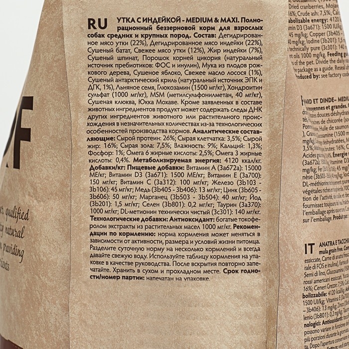 Состав: Дегидрированное мясо утки (22%), Дегидрированное мясо индейки (22%), Сушеный батат, Свежее мясо утки (12%), Жир индейки (7%), Сушеный шпинат, Порошок корней цикория (натуральный