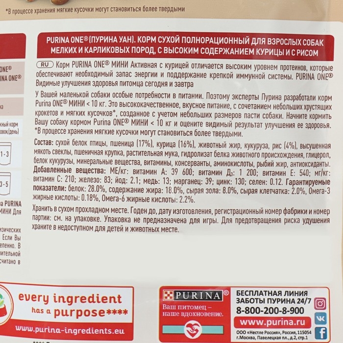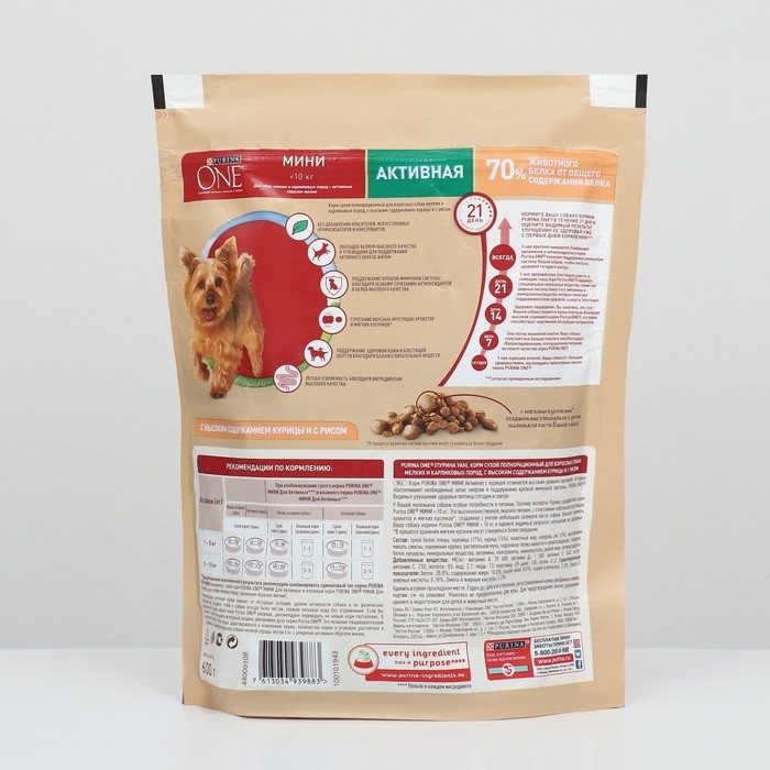 В течение 7 дней уменьшайте исходный рацион, увеличивая дозу корма PURINA ONE. Это позволит пищеварительной системе Вашей собаки лучше адаптироваться к изменению корма. Количество корма в упаковке рассчитано в среднем на 6 дней для взрослой собаки мелкой породы весом 5 кг.