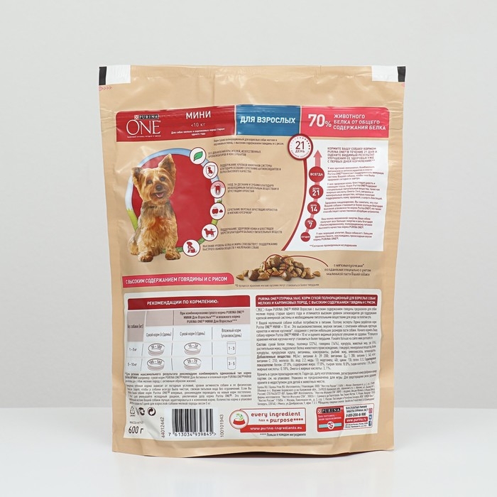 В течение 7 дней уменьшайте исходный рацион, увеличивая дозу корма Purina ONE. Это позволит пищеварительной системе Вашей собаки лучше адаптироваться к изменению корма. Количество корма в упаковке рассчитано в среднем на 6 дней для взрослой собаки мелкой породы весом 5 кг.