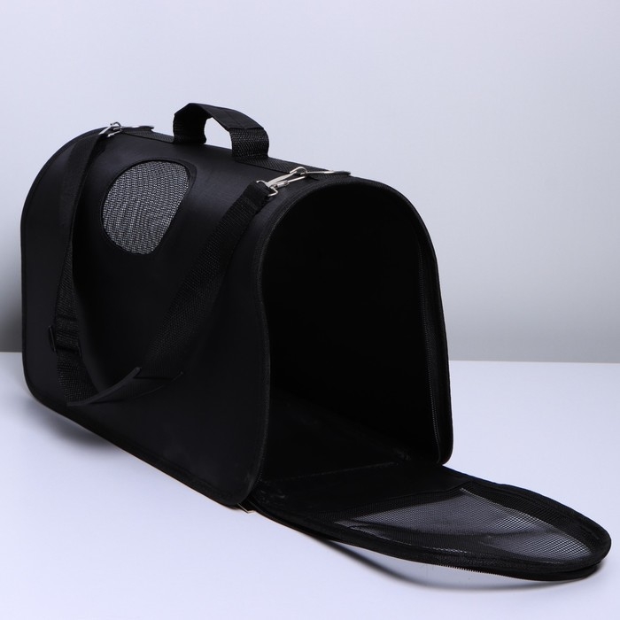 Переноска отлично держит форму за счёт каркаса, имеет жёсткое дно. Открывается переноска сбоку, имеются вентиляционные вставки, чтобы питомец мог свободно дышать.