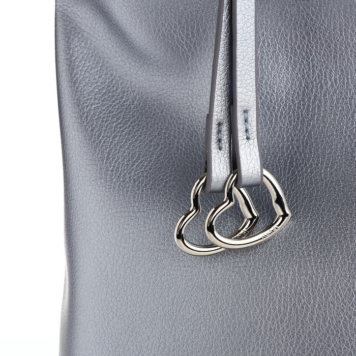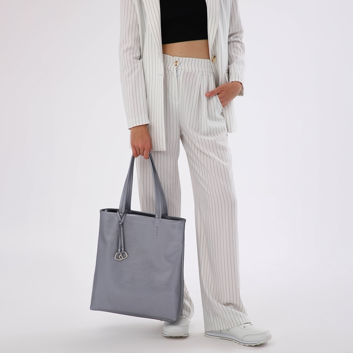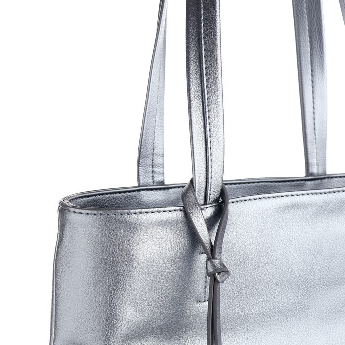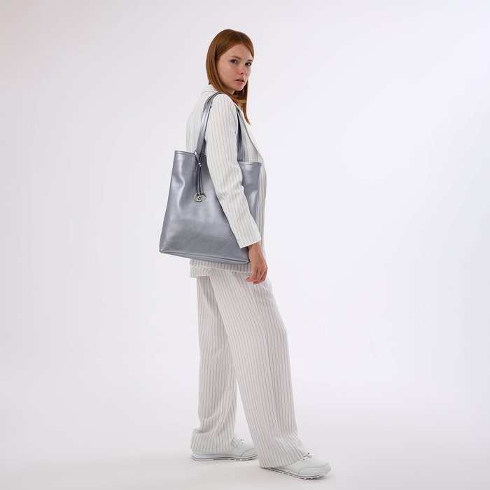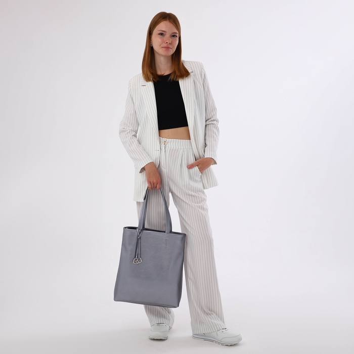 Позвольте себе в этом сезоне добавить блеска в повседневную жизнь с элегантной серебряной сумкой-шопером. Этот аксессуар не только привлекает внимание своим современным дизайном, но и дарит непередаваемое чувство уверенности благодаря своему утонченному цвету и стильной отделке.