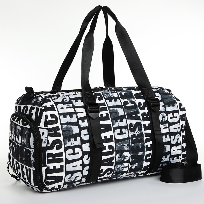 Сумка спортивная на молнии, отдел для обуви, 2 наружных кармана, длинный ремень, средний размер, цвет чёрный/белый