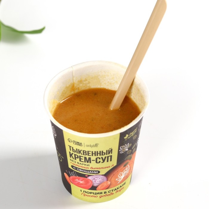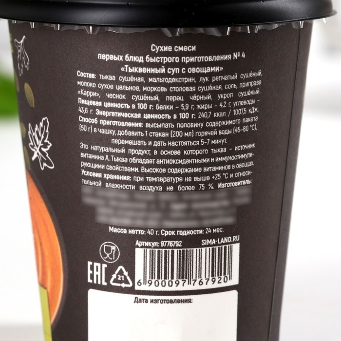 Состав: тыква сушёная, мальтодекстрин, лук репчатый сушёный, молоко сухое цельное, морковь столовая сушёная, соль, приправа "Карри", чеснок сушёный, перец чёрный, укроп сушёный.