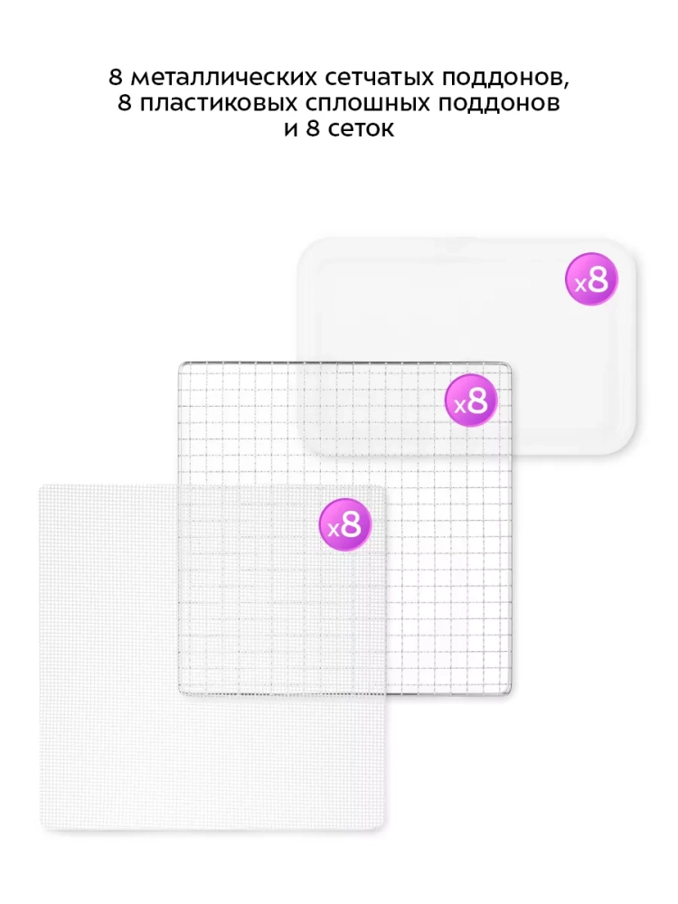 Сушилка имеет в комплекте 8 металлических сетчатых поддонов, 8 пластиковых сплошных поддонов и 8 сеток.