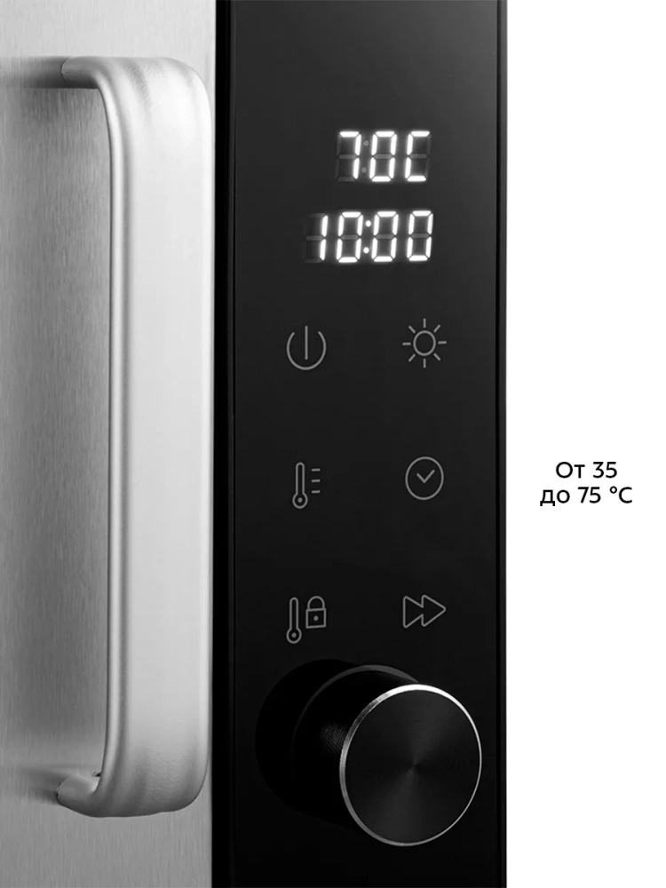 Температуру сушки можно изменить от 35 до 75 °С с шагом 5 °С. Сушилка оснащена таймером от 30 минут до 24 часов работы с шагом 30 минут.