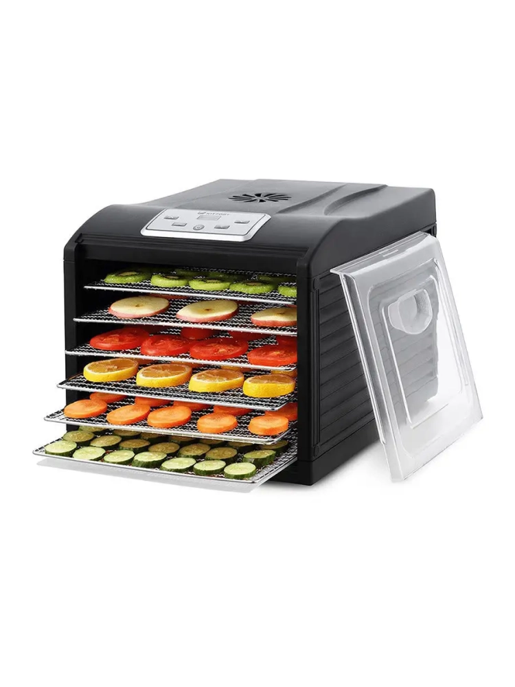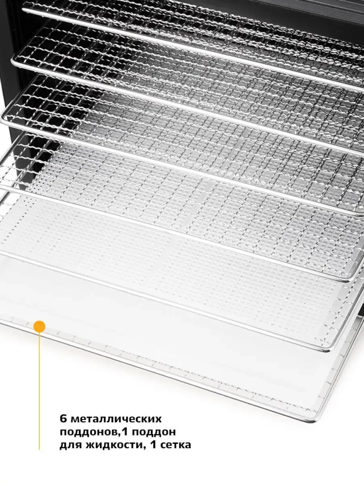 Сушилка имеет в комплекте 6 поддонов из нержавеющей стали, 1 поддон для жидкости и 1 сетку.