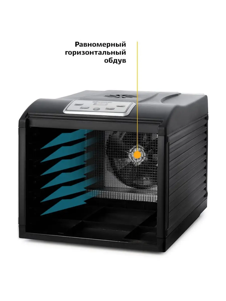 В сушилке установлен мощный нагревательный элемент и вентилятор большого диаметра, обеспечивающий равномерное распределение нагретого воздуха по всему объему камеры. Благодаря горизонтальному обдуву смешение запахов при сушке одновременно разных продуктов минимально.