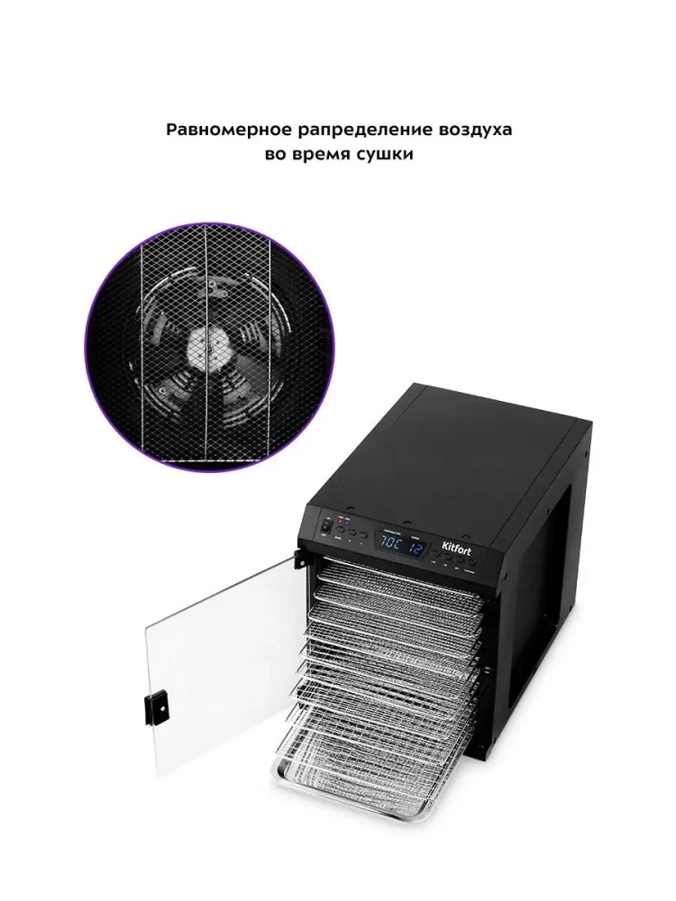 В сушилке установлен мощный нагревательный элемент и вентилятор с лопастями большого диаметра, обеспечивающий равномерное распределение нагретого воздуха по всему объему камеры. Благодаря горизонтальному обдуву смешение запахов при сушке одновременно разных продуктов минимально.