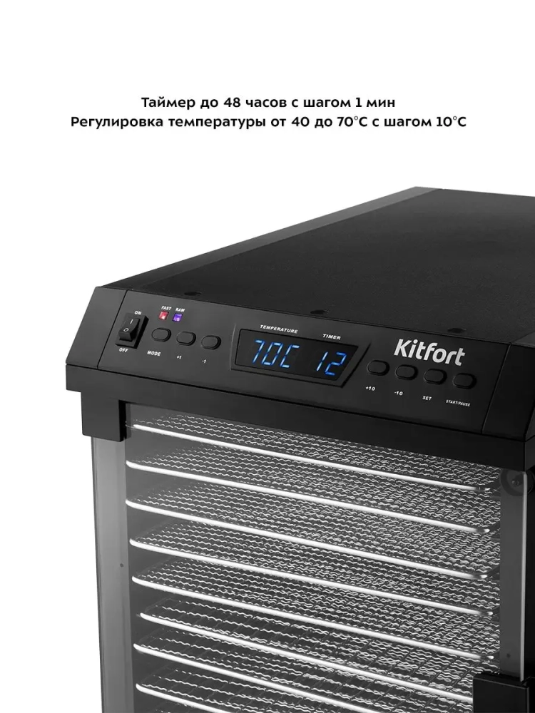 На сушилке можно установить температуру сушки в диапазоне 40–70 *С с шагом 10 градусов. Сушилка оснащена таймером до 48 часов работы с шагом 1 ч.