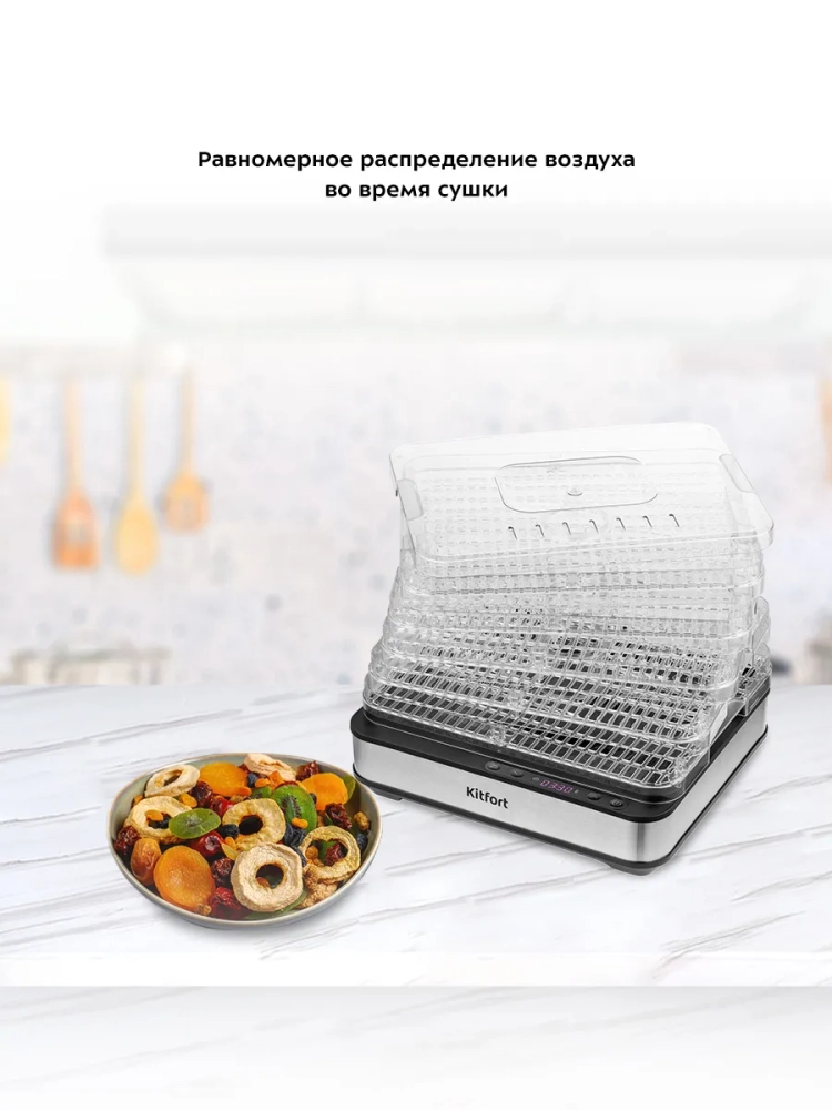 Электрическая сушилка для овощей и фруктов Kitfort КТ-1933 предназначена для сушки овощей, фруктов, ягод, грибов, корнеплодов, трав и зелени, а также хлеба. Сушилка имеет в комплекте 5 поддонов из прозрачного пластика. Благодаря прозрачным пластиковым поддонам вы легко можете наблюдать за процессом сушки. Пластик поддонов — BPA-free, он не содержит Бисфенол А, тем самым данный вид пластика безопасен для здоровья. В сушилке установлен мощный нагревательный элемент и вентилятор, обеспечивающий равномерное распределение нагретого воздуха по всему объему камеры. При помощи кнопок на панели управления вы можете установить температуру в диапазоне 35-70 *С с шагом 1 градус и время в диапазоне от 30 минут до 24 часов с шагом 30 минут.