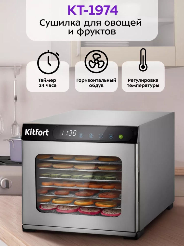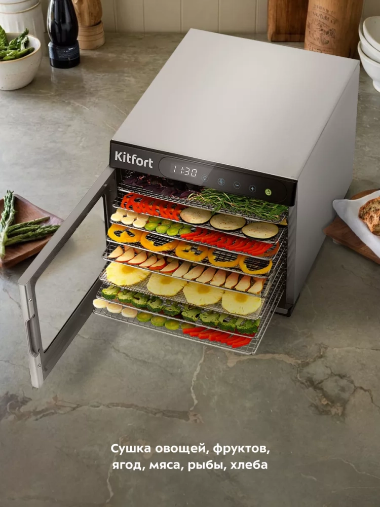 Электрическая сушилка Kitfort КТ-1974 предназначена для сушки овощей, фруктов, ягод, грибов, корнеплодов, трав и зелени, а также мяса и рыбы, хлеба.