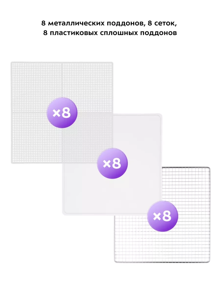 Сушилка имеет в комплекте 6 металлических поддонов, 6 сеток для мелких продуктов и 6 пластиковых сплошных поддонов.