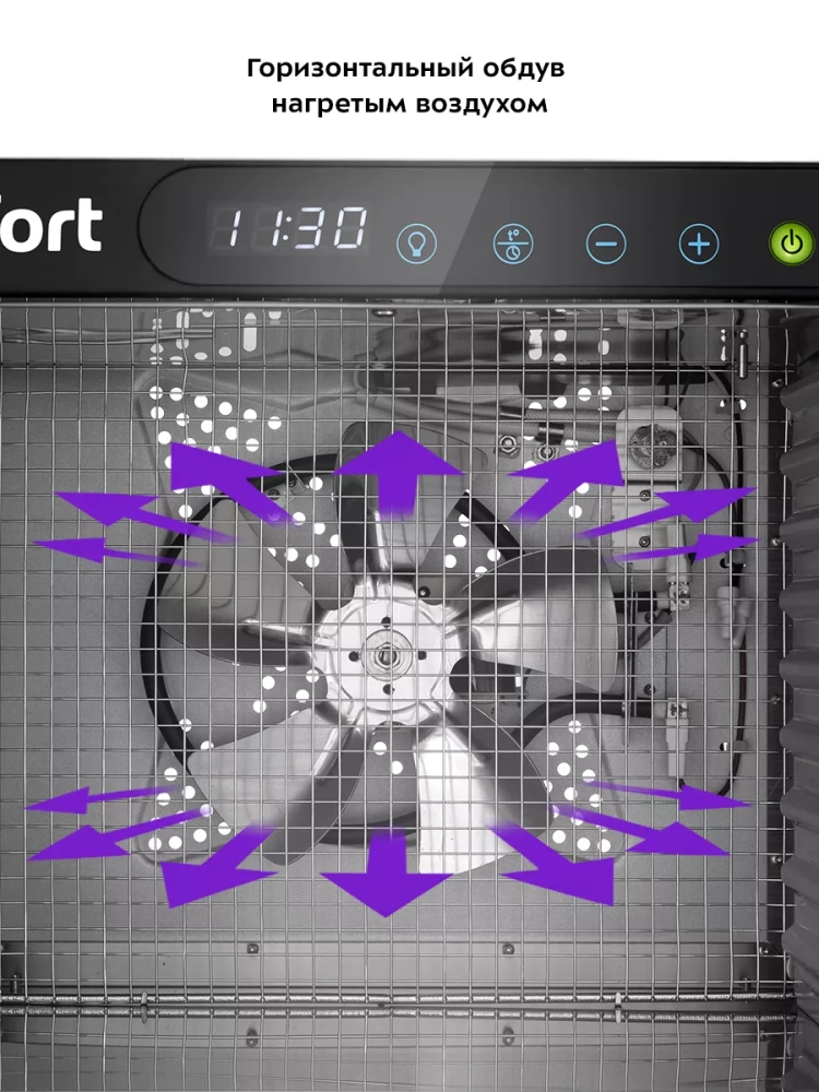 В сушилку установлен мощный нагревательный элемент и вентилятор, обеспечивающий равномерное распределение нагретого воздуха по всему объему камеры. Благодаря горизонтальному обдуву смешение запахов при одновременной сушке разных продуктов минимально.