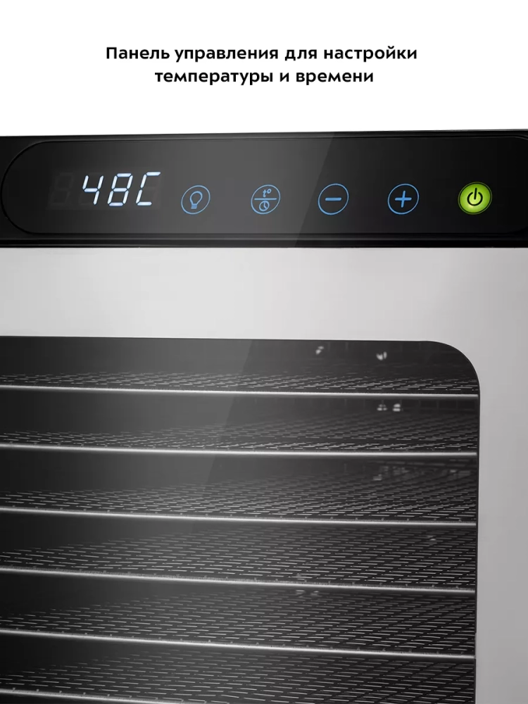 Температуру сушки можно изменить от 35 до 80 °С с шагом 1 °С. Сушилка оснащена таймером до 24 часов работы с шагом 30 минут.