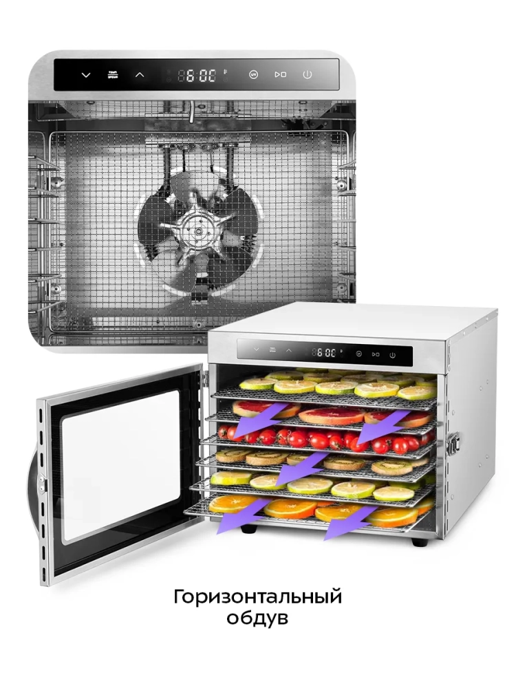 В сушилке установлен нагревательный элемент, а также вентилятор, обеспечивающий равномерное распределение нагретого воздуха по всему объему камеры. Благодаря горизонтальному обдуву смешение запахов при сушке одновременно разных продуктов минимально.